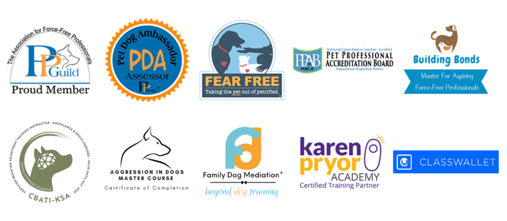 Your trainer has extensive formal education in dog behavior and training. Kim Silver is a Professional Canine Behavior Consultant and Trainer-Accredited, a Karen Pryor Certified Training Partner, a Certified Behavior Adjustment Trainer- Knowledge and Skills Assessed, Fear Free Certified Trainer and Family Dog Mediator. Kim wants to share her knowledge and experience with you!